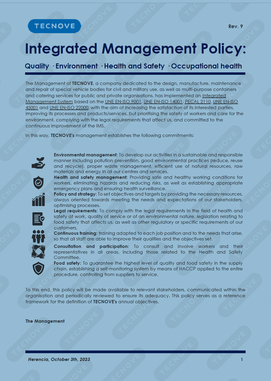 TECNOVE SL develops its main activities under the basic principle of contributing to the development of our environment through the manufacture and supply of innovative products and services of the highest quality, complying with the requirements demanded by our customers and taking special care with our environment and the safety of our workers.